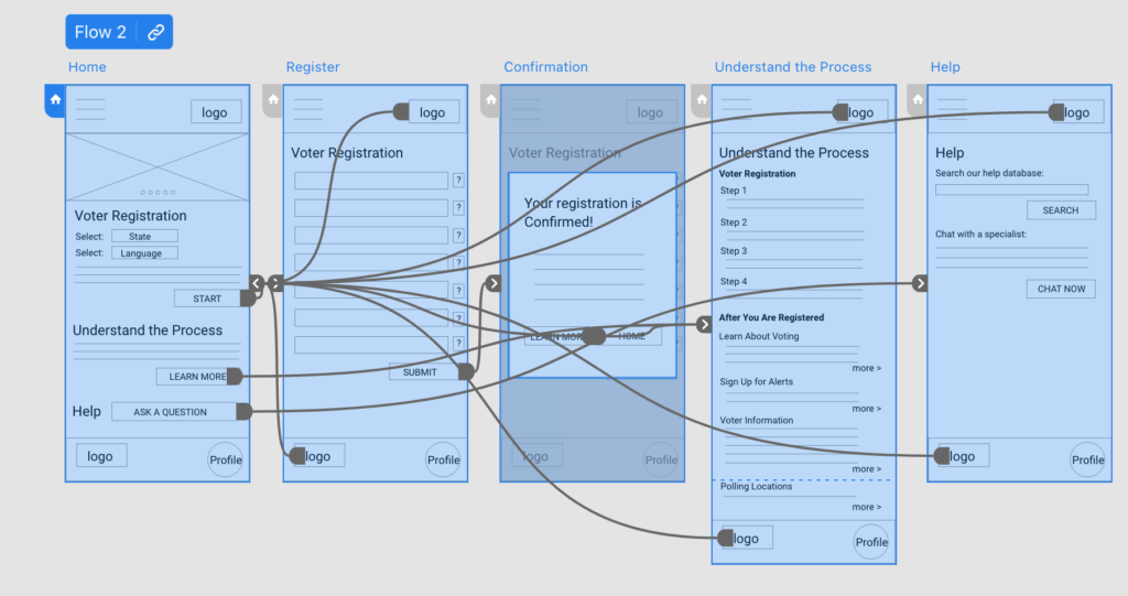 Based on the paper wireframes, digital wireframes were created and turned into a low-fidelity prototype for the first round of user testing