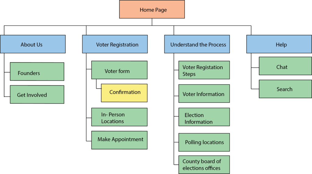 After I completed the app designs for We Are Voters, I started working on the corresponding responsive website. I created a site map to guide the organization of the website.